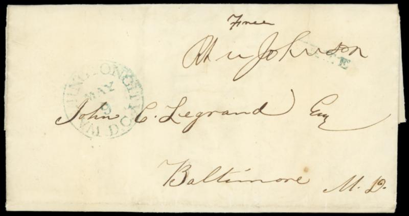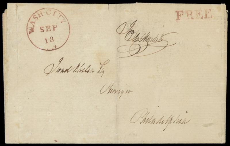 Washington D.C. - Free Frank Collection, 1800-1860s. Collection of over 54 mostly on pages, includes Robert Morrow as Assist. Private Secretary to President Johnson, Ruben Mussey as Mil. Sec. of President Johnson, 1801 Henry Dearborn as Sec. of War, 1839-40 c. Joel R. Pinsett as Sec. of War, 1800 Oliver Wolcott Jr. as Sec. of the Treasury, 1800 John W. Steele as Comptroller of the Treasury, good group of Post Office Dept., large group (26) of Interior Commissioners of Pensions; some faults, F.-V.F. Estimate; $500 - 750. View a PDF of images for this lot US$500-750 (Image)