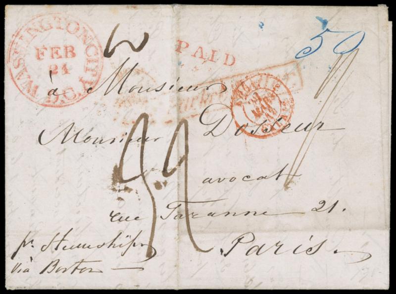 1842 (Feb. 24) Washington D.C. to Paris, France. Gray folded letter with red "Washington D.C. Feb 24" cds with matching sharp "Paid" handstamp and blue ms. "50" cent rating, carried by Cunard Unicorn from Boston Apr. 2nd to Halifax arriving Mar. 7th, then by Cunard Line Acadia from Halifax Mar. 8th to Liverpool arriving Mar. 25th, Liverpool "America, L" oval backstamp and matching "1/-" packet due rating, red London (3.26) backstamp and framed "Packet Letter" handstamp, red Calais (3.28) entry cds with "22" decimes due rating; some fold wear, F.-V.F. and scarce interrupted voyage. Estimate; $200 - 300.
