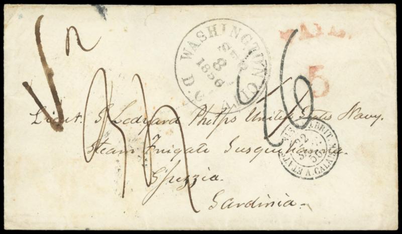 1856 (Sep. 8) Washington D.C. to Spezzia, Sardinia. Cover with neat "Washington City, D.C. Sep 8, 1856" cds with large red "Paid 5 rating handstamp, "Boston, Br. Pkt. 10 Sep" exchange backstamp, carried by Cunard Line Niagara from Boston Sep 10th to Liverpool arriving Sep. 21st, red London (9.22) backstamp and Calais (9.22) transits, various ratings, Spezzia (9.26) arrival backstamp, Very Fine and unusual "Paid 5" rating handstamp. Estimate; $150 - 200. US$150-200 (Image)