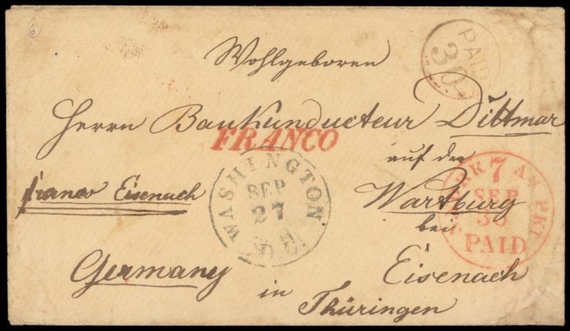 This cover was franked early in Robert E. Lee's career as a U.S. Army officer. After graduating from West Point in 1829, Lee served in various engineering assignments before he was posted to the chief engineer's office in Washington D.C., from 1834-37. This letter was written near the end of that assignment. Shortly afterward he was assigned to supervise the engineering works for the St. Louis harbor and the upper Mississippi and Missouri rivers. US$3,000-4,000 (Image)