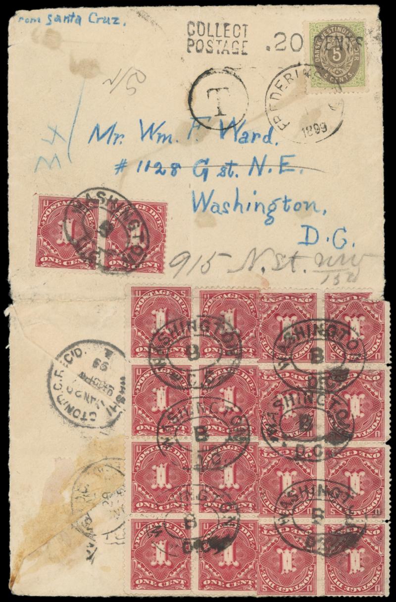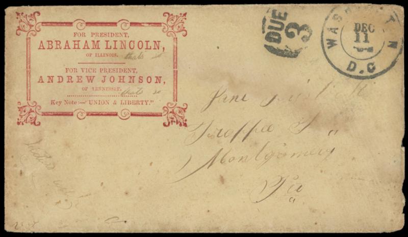1864 Abraham Lincoln - Andrew Johnson. Red fancy framed Lincoln & Johnson campaign corner card and allover "Union Party Platform" political doctrine on reverse, on buff cover endorsed "Soldiers Letter" with "Washington D.C. Dec 11" cds and "Due 3" in circle rating handstamp to Montgomery Pa.; some toning, small edge nicks at right, Fine and rare unlisted design. Milgram No. AL-161 var.; Estimate $300 - 400. US$300-400 (Image)
