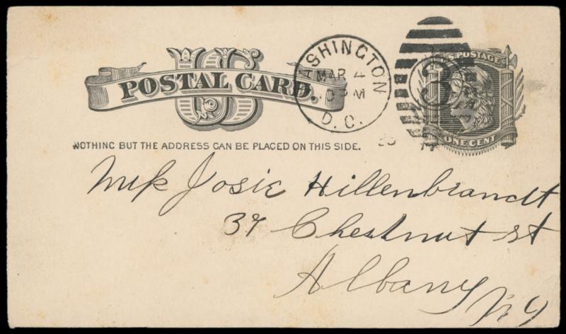 Washington D.C., Mar 4 '85 - Grover Cleveland First Inauguration Day. Bold duplex cancels 1¢ postal card (UX7) to Albany N.Y., reverse with inauguration day message "Washington Mar. 4, 1885, 10-30, this leaves John and me well but tirred after the march…"; couple small tears and creases, otherwise Very Fine and scarce first-person inauguration day use. Estimate; $200 - 300. US$200-300 (Image)