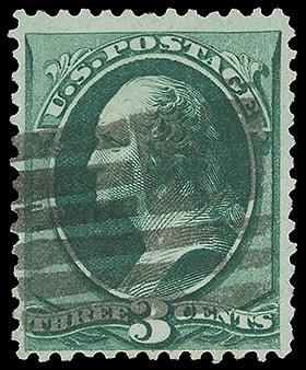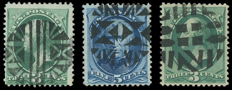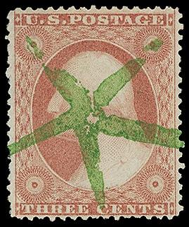 Green 5-Point Radial. Beautiful strike cancels 3¢ dull red (26), well centered, bright and fresh, an Extremely Fine gem with wonderful eye-appeal. Skinner-Eno No. GE-R unlisted; Estimate $200 - 300. US$200-300 (Image)