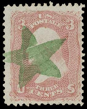 Green Five-Point Star. Of Sharon Vt., vibrant strike cancels 3¢ rose (65), bright and fresh, Very Fine and striking. Skinner-Eno No. ST-S 4; Estimate $150 - 200. US$150-200 (Image)