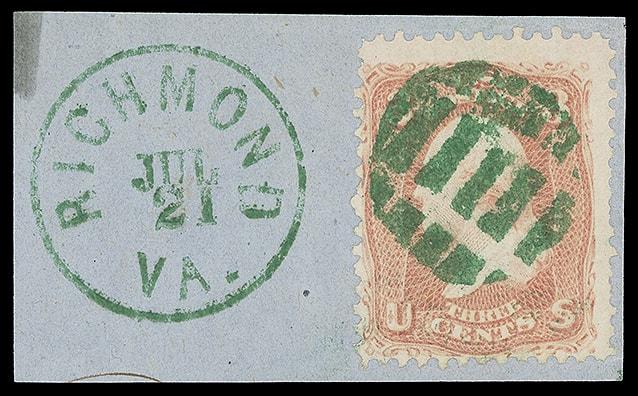 Green Grid. Intense vibrant grid strike duplexed with "Richmond Va. Jul 21" cds ties 3¢ rose (65), short perf, on small blue piece; small tape stain top left, Very Fine and striking. Estimate; $150 - 200. US$150-200 (Image)
