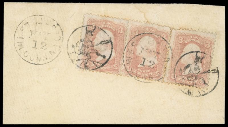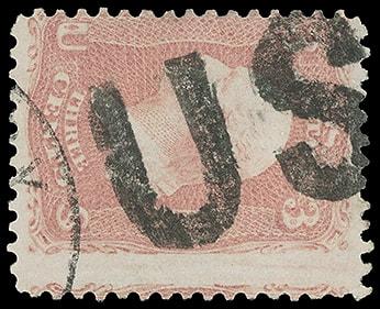 Waterbury, Ct. "U S" fancy cancel. Bold strike with part of cds cancels 3¢ rose (65), missperfed; top right corner perf crease, Very Fine strike, rarity RR. Rohloff No. M-3; Estimate $200 - 300. US$200-300 (Image)