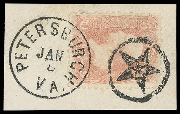 Encircled Star within Star. Bold strike duplexed with "Petersburg Va. Jan 8" ties 3¢ rose (65) on small piece, fresh and Extremely Fine. Skinner-Eno No. ST-St 21; Estimate $150 - 200.