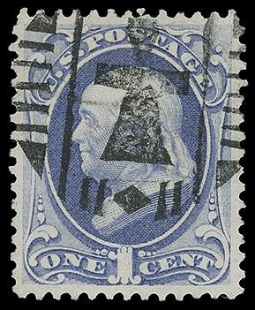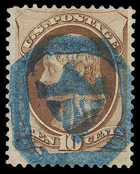 Shield in Octagonal Frame. Of Chicago Ill., perfect bold blue strike cancels 10¢ brown (150), Extremely Fine strike. Cole No. SH-113; Estimate $150 - 200. US$150-200 (Image)
