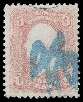 Flag. Of Whitehall N.Y., blue strike cancels 3¢ rose (65); light creasing, fresh and Very Fine strike of this patriotic cancel. Skinner-Eno No. PT-F 26; Estimate $150 - 200. US$150-200 (Image)
