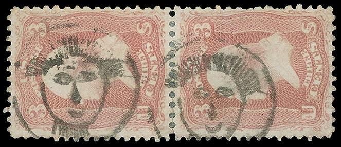 Man's Face in Circle. Of Columbus Wisc., two clear strikes cancel 3¢ rose (65) vertical pair, reinforced separation, couple short perfs, Very Fine strikes. Skinner-Eno No. PH-M 8; Estimate $200 - 300. US$200-300 (Image)