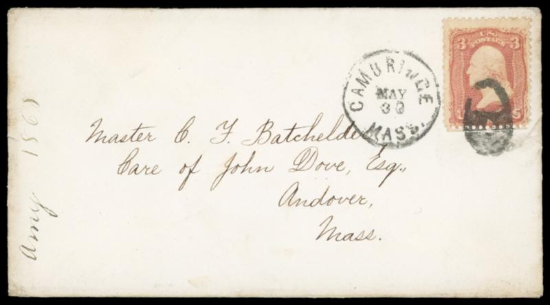 Padlock. Bold strike duplexed with "Cambridge Mass. May 30" cds tie 3¢ rose (65) on cover from Batchelder corrrespondence to Andover Mass., 1868 docketed at left; flap tear, Very Fine and choice strike. Skinner-Eno No. PO-Pl 4; Estimate $300 - 400. US$300-400 (Image)