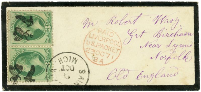 "Shoo-Fly". Sharp bold strikes duplexed with "Saint Clair, Mich. 2 Oct" cds cancel 3¢ green (147) horizontal pair on 1871 mourning cover to Lynn, England, partial Oct. 25 arrival backstamp, Very Fine,ex-Knapp, Emerson, with 1990 P.F. certificate. Whitfield No. 597; Estimate $400 - 600.