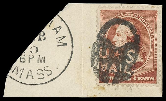 "U.S. Mail" Padlock. Complete strike duplexed with partial "Stoneham Mass., Feb 15" cds ties 2¢ red brown (210) on small piece; vertical crease to left of stamp, Very Fine strike. Cole No. LCK-3; Estimate $300 - 400. US$300-400 (Image)