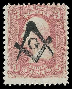 Masonic Square & Compass with positive "G". Intense strike cancels 3¢ rose (65), rich color, an Extremely Fine strike. Skinner-Eno No. FR-M2a 9; Estimate $150 - 200. US$150-200 (Image)