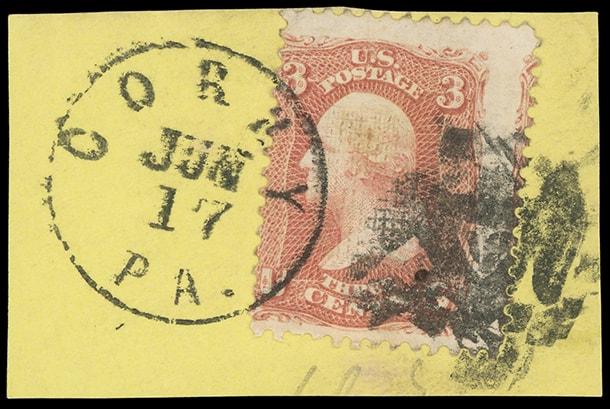 Corry, Pa. "Eagle & Shield" fancy cancel. Bold strike duplexed with "Corry Pa., Jun 17" cds on small yellow piece. Skinner-Eno No. PT-E 4; Estimate $200 - 300. US$200-300 (Image)
