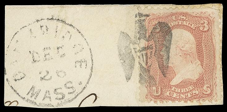 Eagle and Shield. Clear strike duplexed with "Cambridge Mass. Dec 26" cds ties 3¢ rose (65) on piece, Very Fine and rare, unlisted in Skinner Eno. Whitfield No. 441; Estimate $200 - 300. US$200-300 (Image)