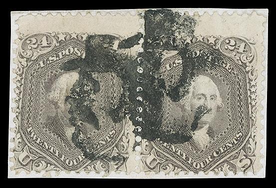 New York City Union Soldier's Head. Two strikes tie 24¢ lilac (78) pair on small piece; right with small perf flaw at top, Very Fine patriotic cancel,ex-Emerson, Erivan. Skinner-Eno No. PH-F 73; Estimate $500 - 750.