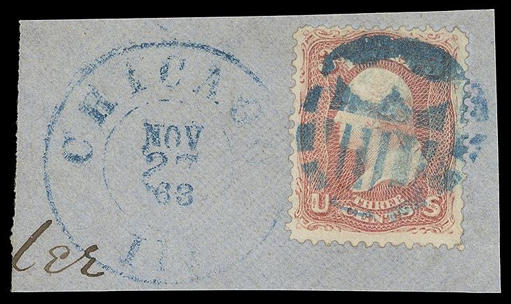 Blue Shield in Segmented Frame. Complete strike duplexed with "Chicago Ill. Nov 27, '63" cds ties 3¢ rose (65) on small blue piece, Very Fine and scarce cancel. Estimate; $150 - 200. US$150-200 (Image)