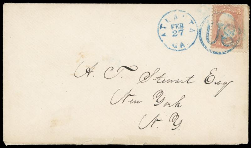 "U.S." in Circle. Blue strike duplexed with "Atlanta Ga. Feb 27" cds ties 3¢ rose (65), toned corner, on 1867 cover to New York City, original 1867 datelined enclosure; small bottom edge and 3¢ flaws, Very Fine strike of this Georgia patriotic cancel. Skinner-Eno No. PT-US 57; Estimate $150 - 200. US$150-200 (Image)