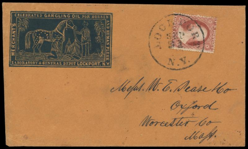 (Cameo - Medical) Merchant's Celebrated Gargling Oil. Blue illustrated cameo corner card showing Horse and Men in Arabian Dress on orange cover bearing 3¢ dull red (26) tied by "Lockport N.Y., Sep 21" cds to Oxford, Mass.; part of backflap missing, Very Fine example of this classic cameo ad cover. US$0 (Image)
