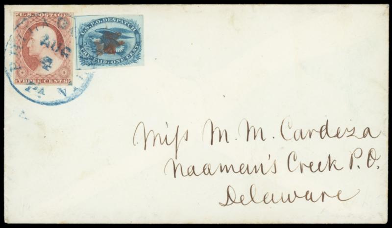 Carrier, 1851, 1¢ Eagle. Canceled by Philadelphia red star, used with 3¢ dull red (11A), large margins except touched at top, both tied by blue "Philadelphia Pa. Aug 4" cds on cover to Naaman's Creek, Delaware, fresh and Very Fine. Scott No. LO2; $500. US$0 (Image)