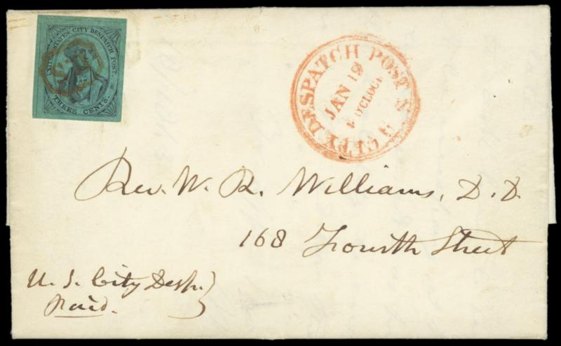 New York, N.Y., U.S. City Despatch Post, 1842-45, 3¢ black on blue green. Position 11-R, large to huge margins including framelines at left and top, canceled by "U.S." in Octagon handstamp, matching "U.S. City Despatch Post, Jan 19., 4 O'Clock" on 1843 folded letter to local New York City street address, endorsed "U.S. City Desp., Paid" at lower left, Extremely Fine and choice use,ex-Caspary, with 2025 P.F. certificate. Scott No. 6LB5; Estimate $750 - 1,000. US$750-1,000 (Image)