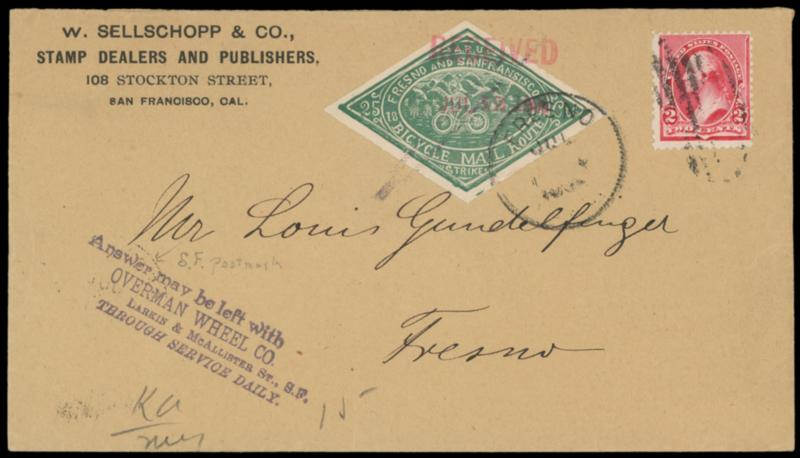 This inter-city service was established during the railroad union strike in 1894 by the Fresno agent for Victor bicycles, Arthur C. Banta. Service commenced on July 6 and was discontinued on July 18 when the strike ended. Only 380 letters were carried during the brief period of operation. US$3,000-4,000 (Image)