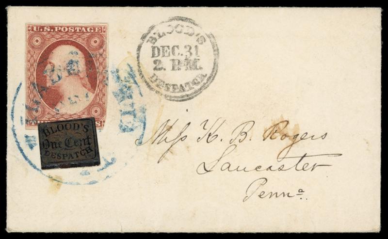 Blood & Co., 1850 (1¢) bronze on black. Two covers, first used with 3¢ dull red, ty. II (11A), neatly affixed overlapping and tied together by blue "Philadelphia Pa" cds, "Blood's Despatch Dec. 31 2 P.M." double-line cds on small cover to Lancaster Pa., 3¢ stamp with creases, neat and Very Fine appearing small cover, second with 15L14 acid tied, used with 3¢ dull red (26) on 1857 cover to Debuque, Iowa, 3¢ stamp pulled perf, Very Fine pair. Scott No. 15L13; Estimate $150 - 200. US$150-200 (Image)