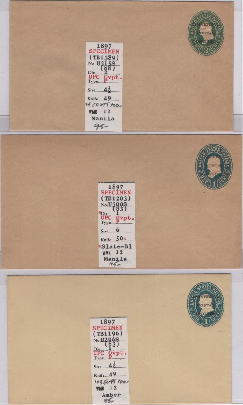 (3) Universal Postal Congress specimen entires: U296S, U300S & U315S; ea w/ dealer notation in pencil on back, o/w VF (Image)