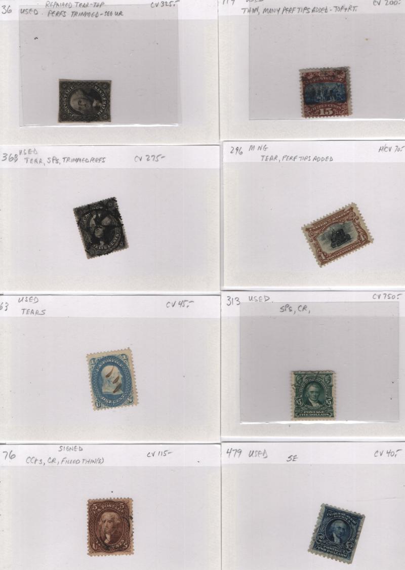 Group (8) */O 1857//1903 mostly used sorted on IDed dealer cards incl Used: #36, 36B, 63, 76, 119, 313, 479 & unused 296 NG; owner's CV $1,820 (NV); cond mixed, all w/ flts (SE, tears, creases, perf tips added, etc), Avg to F-VF (Image)