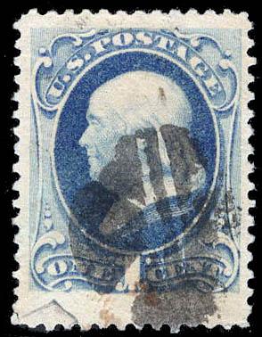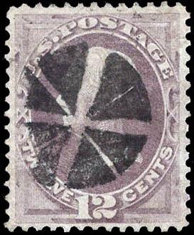 1870, 12¢ Clay, dull violet, without grill, N.B.N.C. printing (Scott 151), well centered, with a beautifully struck socked-on-the-nose circle-of-wedges cancel, Very Fine. Scott $200. Estimate $100 - 150. Scott $200 Suggested Bid $100-150 (Image)