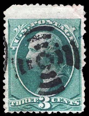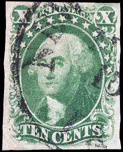 1855, 10¢ Washington, green, type III (Scott 15), 4 large margins, neat town cancel, Very Fine. Scott $145. Estimate $80 - 120. Scott $145 Suggested Bid $80-120 (Image)