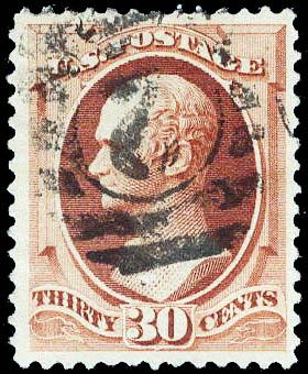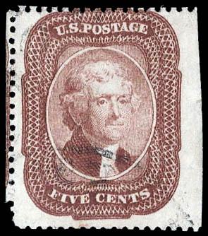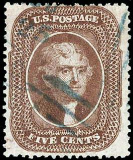 1860, 5¢ Jefferson, brown, type II (Scott 30A), lightly canceled; with three handstamps on reverse, Fine to Very Fine. Scott $375. Estimate $100 - 150. Scott $375 Suggested Bid $100-150 (Image)
