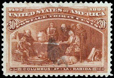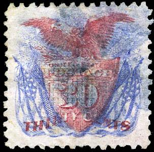 1869, 30¢ Shield, Eagle and Flags, ultramarine & carmine (Scott 121), beautifully well centered and lightly canceled; a faint crease, otherwise Extremely Fine. Scott $450. Estimate $100 - 150. Scott $450 Suggested Bid $100-150 (Image)
