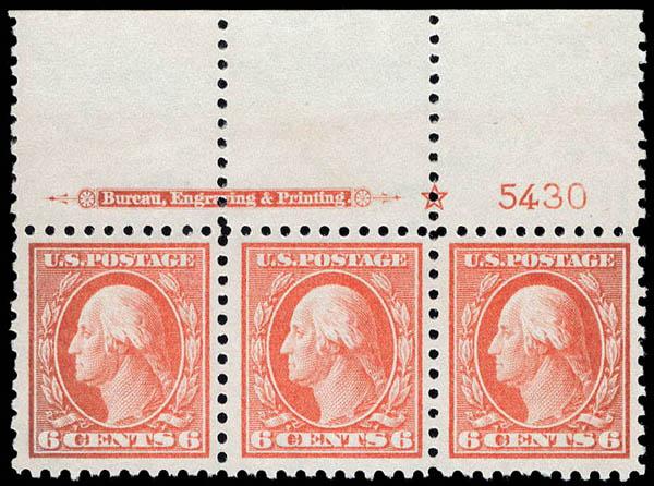1914, 6¢ Washington, red orange, S.L. watermark, perf. 10 (Scott 429), plate number and imprint strip of 3, o.g., never hinged, Fine to Very Fine, with 2018 P.F. certificate. Scott $330. Estimate $100 - 150. Scott $330 Suggested Bid $100-150 (Image)