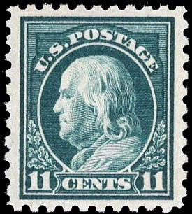 1916, 11¢ Franklin, dark green, unwatermarked, perf. 10 (Scott 473), o.g., never hinged, Very Fine to Extremely Fine, with 2008 P.S.E. certificate graded VF-XF 85. Scott $110. SMQ $150. Estimate $100 - 150. Scott $110 Suggested Bid $100-150 (Image)