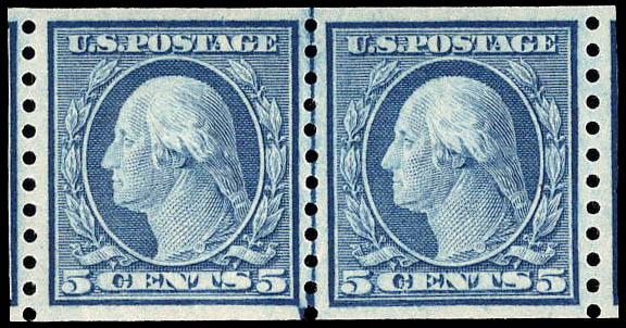 1919, 5¢ Washington, blue, unwatermarked, rotary press coil, perf. 10 vertically (Scott 496), line pair, o.g., never hinged, Very Fine, with 2021 P.S.E. certificate graded VF 80. Scott $65. SMQ $65. Estimate $40 - 60. Scott $65 Suggested Bid $40-60 (Image)
