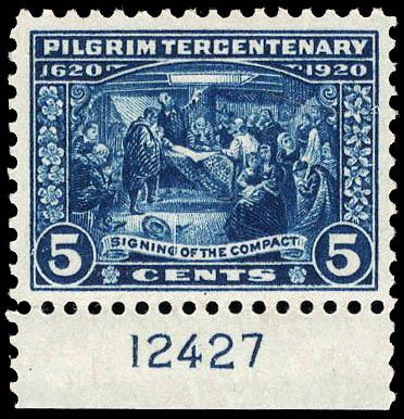 1920, 5¢ Pilgrim (Scott 550), a beautifully well centered plate number single, o.g., never hinged, Very Fine to Extremely Fine, with 2025 P.F. certificate graded VF-XF 85. Scott $70. SMQ $150. Estimate $80 - 120. Scott $70 Suggested Bid $80-120 (Image)