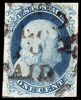 1851, 1¢ Franklin, blue, type II (Scott 7), plate 1E, mostly large margins (just touching at the top), town postmark and nicely struck PAID cancel, Fine to Very Fine, with 2025 P.F. certificate. Scott $140. Estimate $60 - 80. Scott $140 Suggested Bid $60-80 (Image)