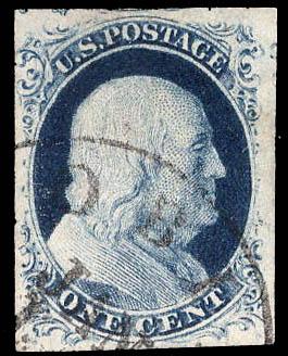 1852, 1¢ Franklin, blue, type IV (Scott 9), position 32L1L, 4 clear to large margins, light town postmark; small thin at top right, otherwise Very Fine to Extremely Fine, with 2025 P.F. certificate. Scott $100. Estimate $30 - 40. Scott $100 Suggested Bid $30-40 (Image)