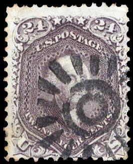 1862, 24¢ Washington, red lilac (Scott 70), cogwheel cancel; small thin, Fine appearance. Scott $300. Estimate $40 - 60. Scott $300 Suggested Bid $40-60 (Image)