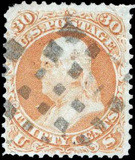 1861, 30¢ Franklin, orange (Scott 71), neat cancel, Fine to Very Fine. Scott $250. Estimate $75 - 100. Scott $250 Suggested Bid $75-100 (Image)