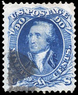 1861, 90¢ Washington, blue (Scott 72), bright fresh color and a light corner circle-of-wedges cancel; tiny corner crease, otherwise Fine. Scott $625. Estimate $150 - 200. Scott $625 Suggested Bid $150-200 (Image)