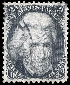 1863, 2¢ Jackson, black (Scott 73), a used gem, beautifully well centered and lightly canceled, Extremely Fine. Scott $75. Estimate $100 - 150. Scott $75 Suggested Bid $100-150 (Image)