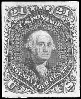 1863, 24¢ lilac, plate proof on India paper (Scott 78P3), wonderfully intense color, Extremely Fine. Scott $80. Estimate $40 - 60. Scott $80 Suggested Bid $40-60 (Image)
