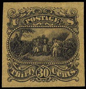 1869, 30¢ Burgoyne essay, in black on yellow (Scott 121-E1p. Brazer 121E-Ck), plate proof on thin surface-tinted paper, Extremely Fine. Scott $175. Estimate $75 - 100. Scott $175 Suggested Bid $75-100 (Image)