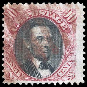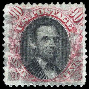 1869, 90¢ Lincoln, carmine & black (Scott 122), bright fresh color and a lovely red cancel (a premium cancel color); a small faint crease, otherwise nearly Fine. Scott $3,100. Estimate $350 - 500. Scott $3,100 Suggested Bid $350-500 (Image)