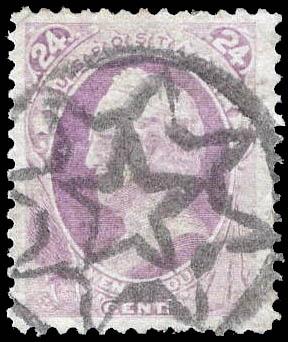 1870, 24¢ Scott, purple, without grill, N.B.N.C. printing (Scott 153), beautifully struck New York Foreign Mail cancel, Fine to Very Fine. Scott $225. Estimate $100 - 150. Scott $225 Suggested Bid $100-150 (Image)