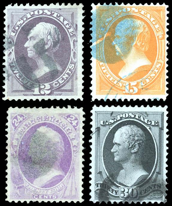 1870, a group of 4 used N.B.N.C. printings without grill (Scott 151-154), includes 12¢ Clay, dull violet, 15¢ Webster, bright orange, 24¢ Scott, purple and 30¢ Hamilton, black, a lovely group of Banknotes, all lightly canceled, Fine, all with 2023 P.F. certificates, most graded F 70 and the last is F-VF 75. Scott $903. SMQ $515. Estimate $250 - 350. Scott $903 Suggested Bid $250-350 (Image)