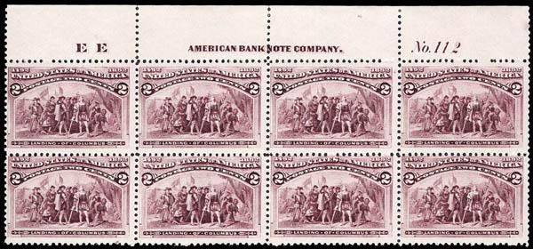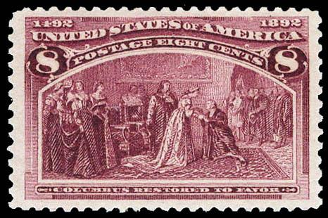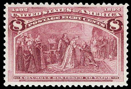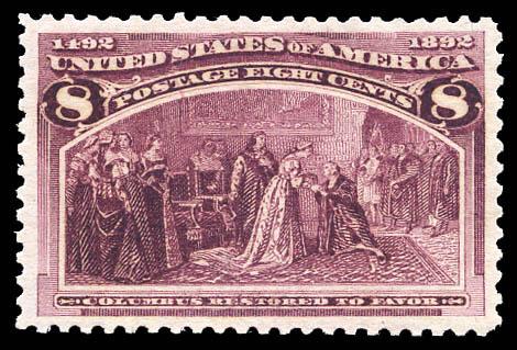 1893, 8¢ Columbian (Scott 236), a gem with near perfect centering, o.g., invisibly hinged (appears n.h.), Extremely Fine to Superb, with 1985 P.F. certificate as "unused o.g." Scott $50. Estimate $100 - 150. Scott $50 Suggested Bid $100-150 (Image)